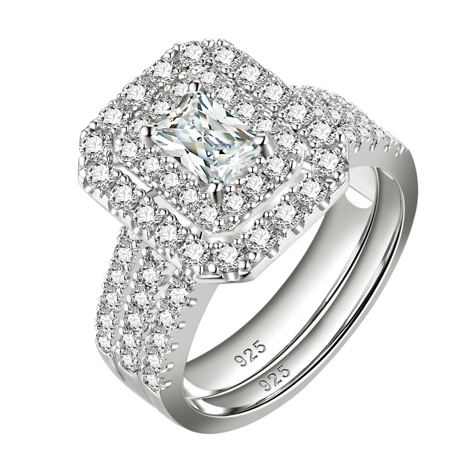 2 Pieces 925 Sterling Silver Engagement Wedding Rings Set for Women Double Halo Radiant Cut AAAAA CZ Gorgeous Jewelry